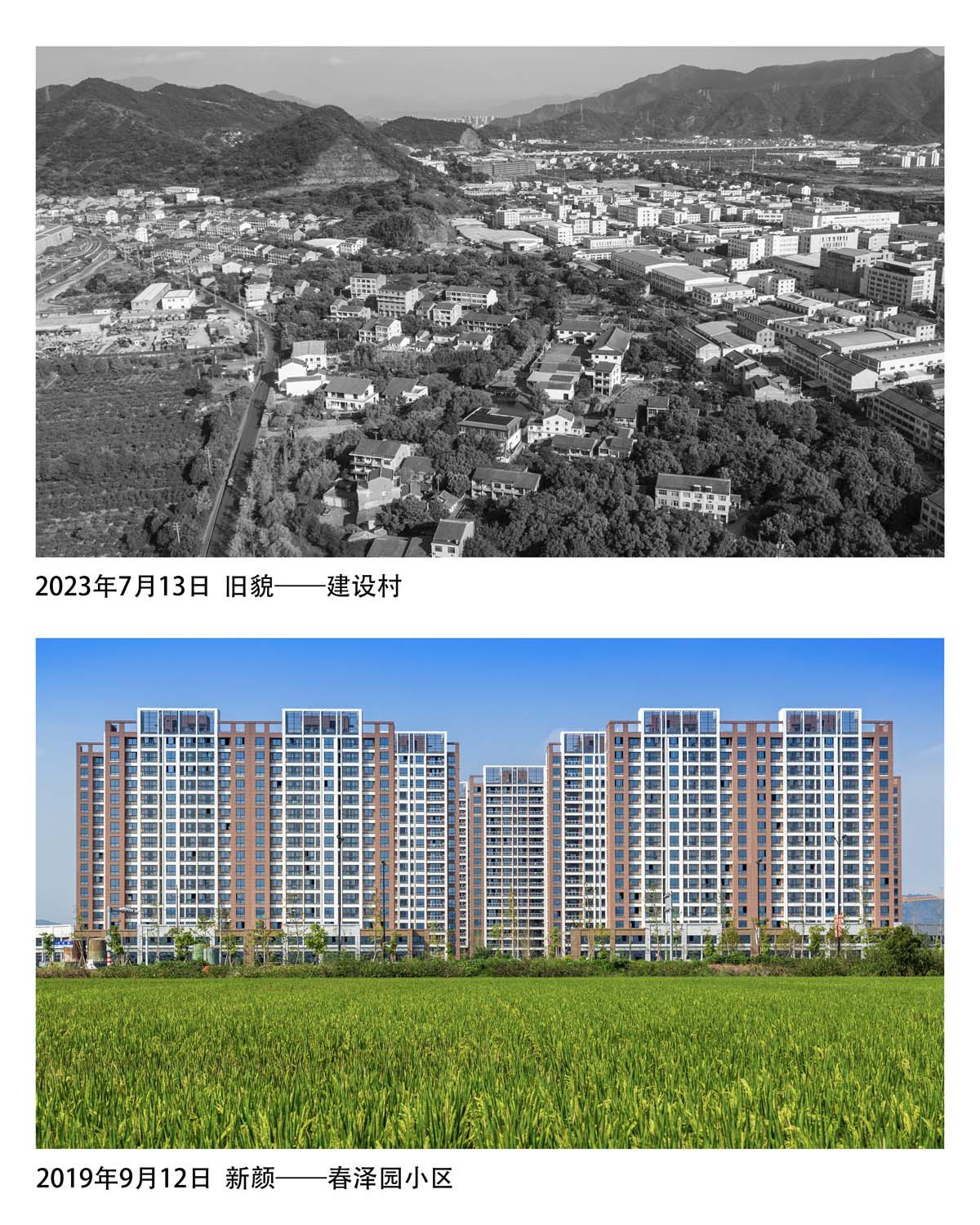 返回頂部>> 照片說(shuō)明: 鄉(xiāng)村新繪1:2023年7月13日 舊貌——建設(shè)村+2019年9月12日 新顏——春澤園小區(qū)