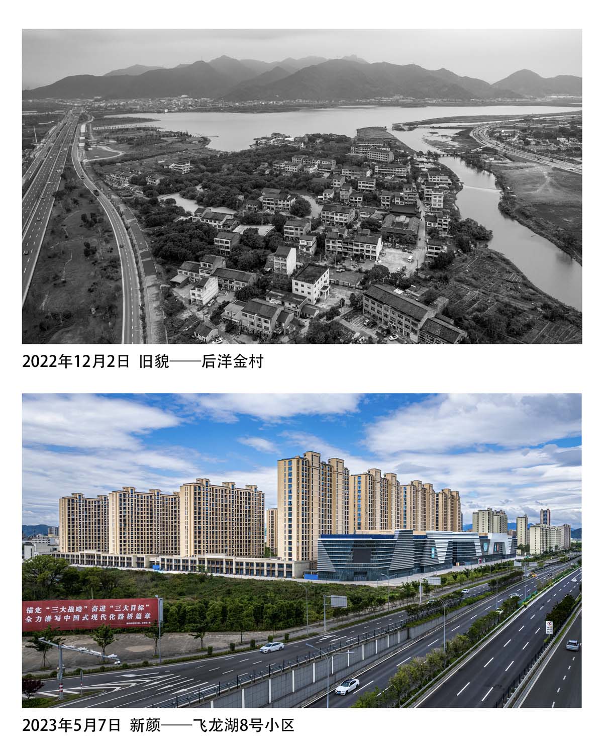 返回頂部>> 照片說(shuō)明: 鄉(xiāng)村新繪4:2022年12月4日 舊貌——新龍岙村+2024年5月14日 新顏——飛龍湖4號(hào)小區(qū)