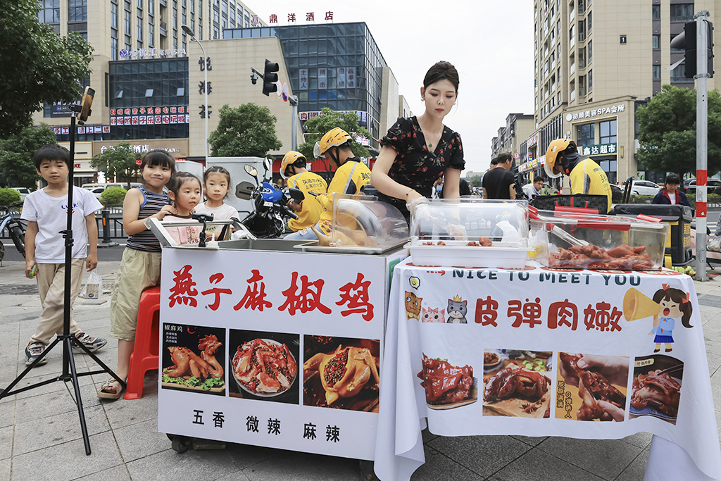 返回頂部>> 照片說明: 6-6 賣雞的老板娘很會做生意,線上線下同時進(jìn)行開放,生意非常紅火。