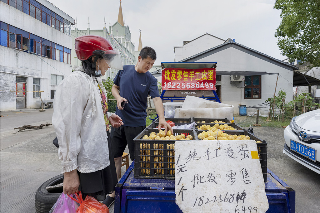 返回頂部>> 照片說明: 6-3 純手工皮蛋批發(fā)零售一元一個,那手寫的東倒西歪的幾個大字特別顯眼。