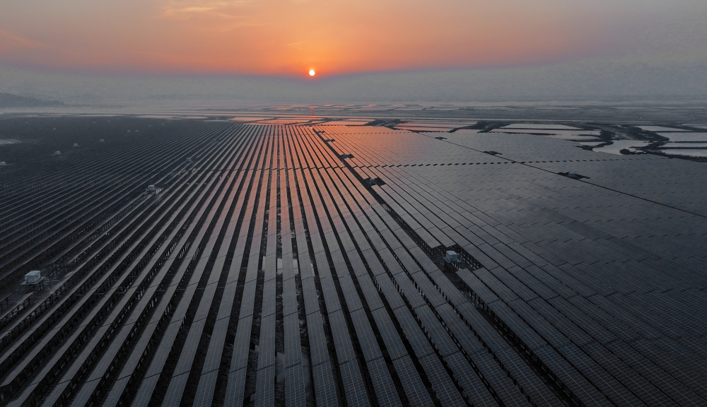 返回頂部>> 照片說(shuō)明: 霞映光伏 2024年3月30日,落日照耀在千畝的光伏上,一幅蔚為壯觀景象。華能浙江玉環(huán)清港灘涂“漁光互補(bǔ)”光伏電站是全國(guó)首座潮間帶全漁光互補(bǔ)生態(tài)光伏電站,也是全國(guó)首座建設(shè)施工和生態(tài)治理、漁業(yè)養(yǎng)殖一體化同步實(shí)施的生態(tài)光伏電站。總投資5.94億元,灘涂用地約1800畝。鋪設(shè)了24萬(wàn)多塊單晶硅光伏組件,裝機(jī)容量達(dá)130兆瓦,并新建一座110千伏海上升壓站。項(xiàng)目預(yù)計(jì)年發(fā)電量1.5億千瓦時(shí),每年可節(jié)約標(biāo)準(zhǔn)煤約4.5萬(wàn)噸,減少二氧化碳排放量達(dá)11萬(wàn)噸以上。
