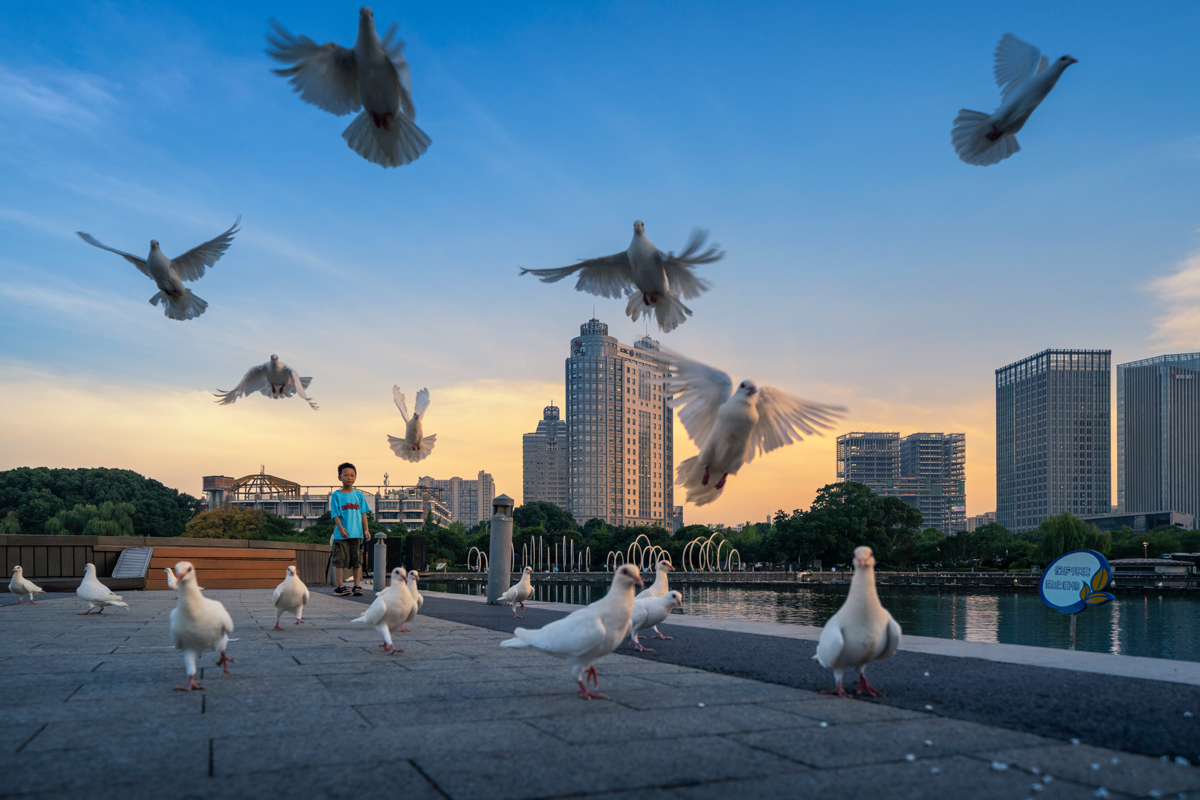 2022年7月12日,在臺州市市民廣場看到人和鴿子和諧相處,就拿起相機拍下此場景。