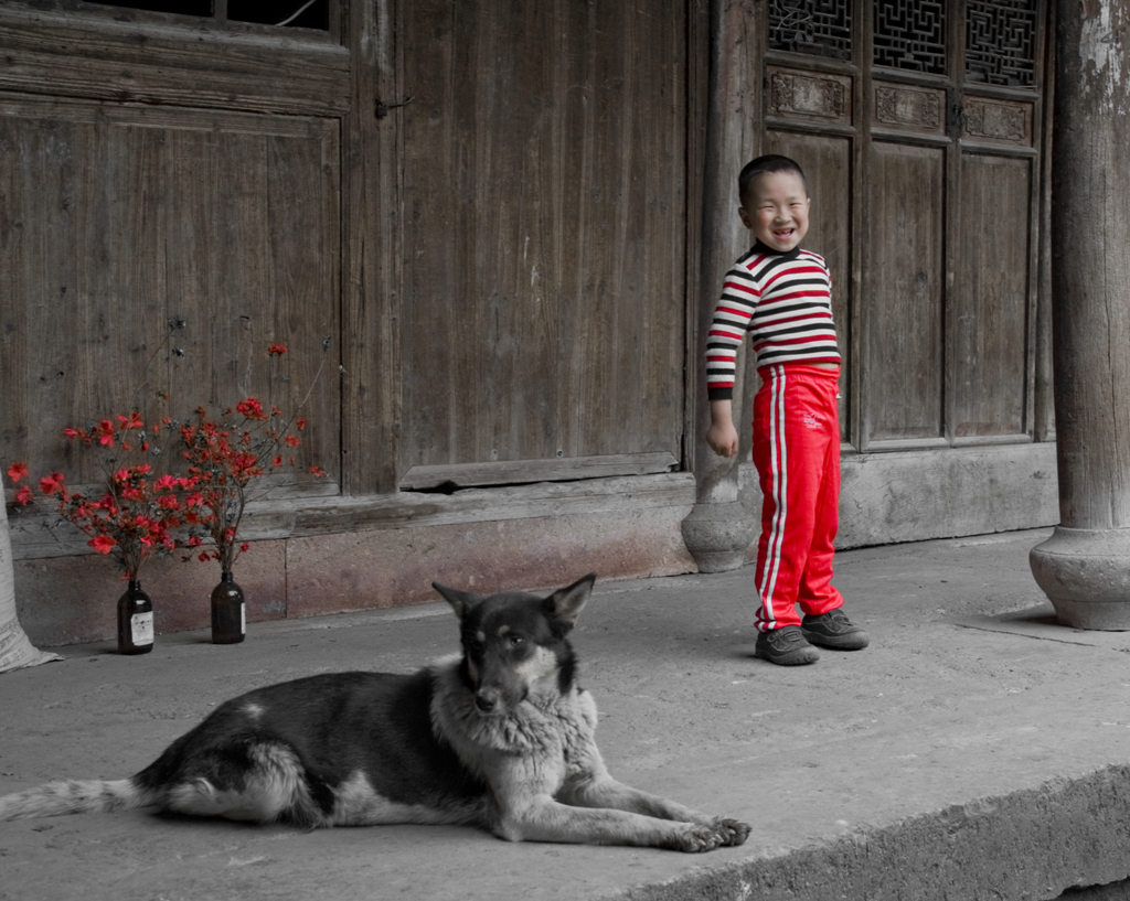 高遷下屋村的老宅里,墻角的映山紅獨自怒放著,天真爛漫的孩子無邪地笑著,安靜的狗狗陪伴著小主人。