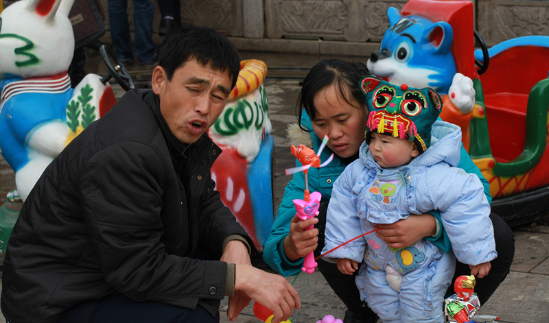 2012年1月19日,臨近春節,溫嶺市街心公園,辛苦了一年的媽媽準備給孩子買一個玩具,正在跟賣家講價。