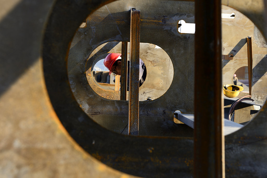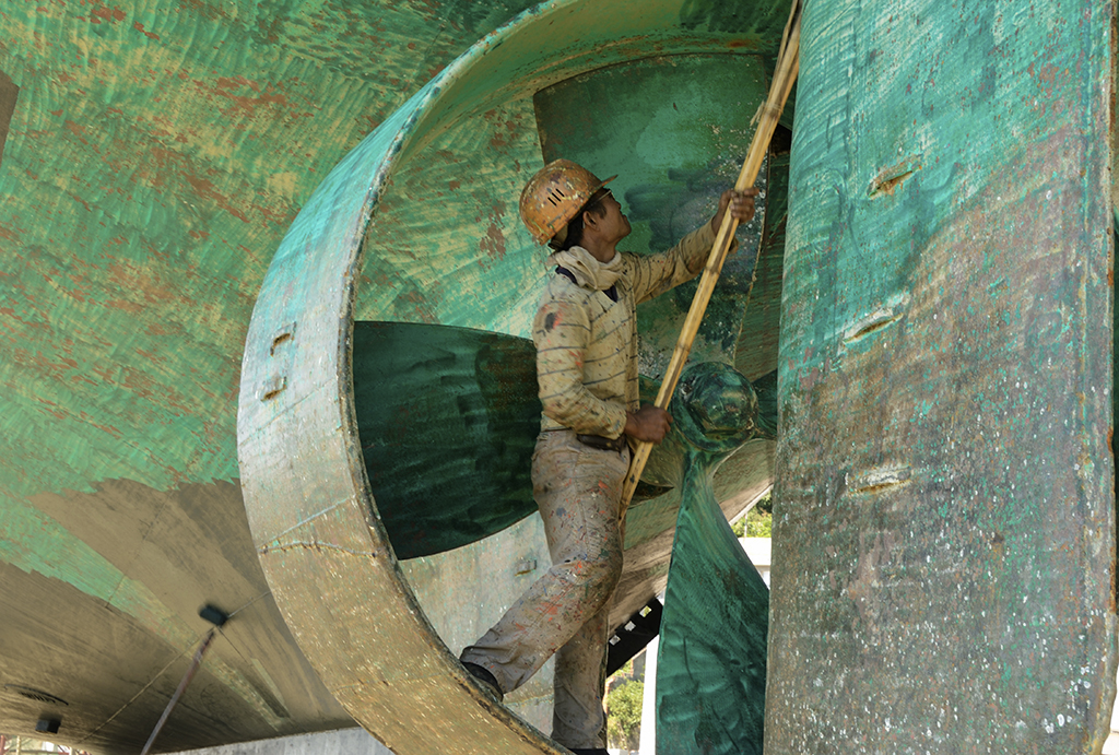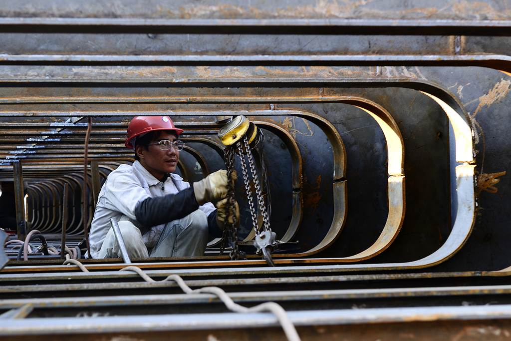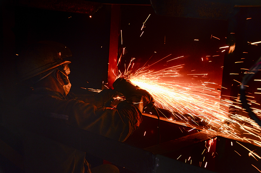 作品介紹:  造船工人在不同的崗位上干得熱火朝天。細節決定遠航。