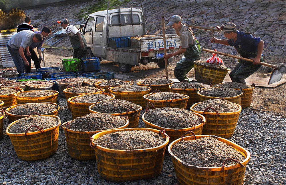 城南漁民在海塗上養殖蟶苗,圖為漁民收集蟶苗,準備運往山東沿海種殖。