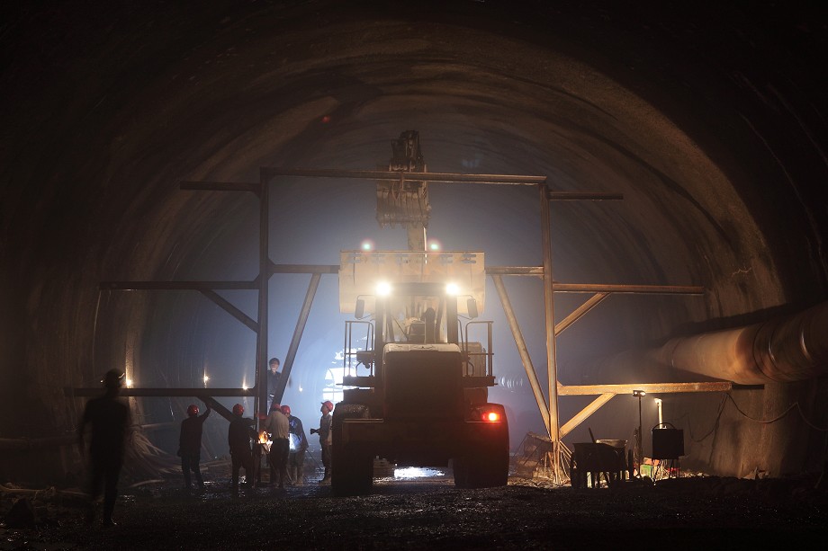 黃巖江口一隧道施工現場,工人們在緊張工作中。