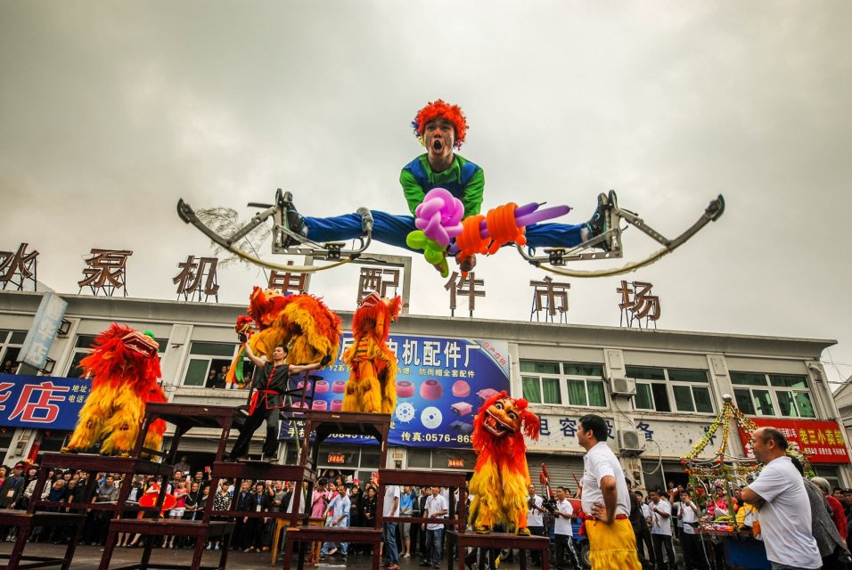 一名衣著華麗的表演者在大溪水泵機電配件市場前騰飛,預示著臺州經濟也正以騰飛的速度迅猛發展。