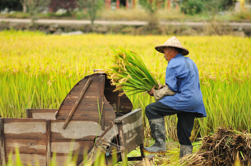 一位老者正在打稻谷。