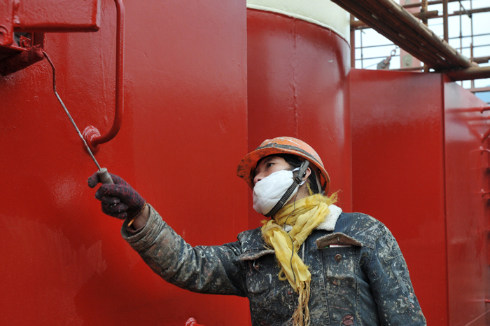造船廠的工人全神貫注的工作中,紅色的背景象征著火紅的事業