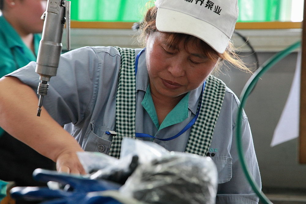 新界泵業女工聚精會神、埋頭裝配合格的產品。