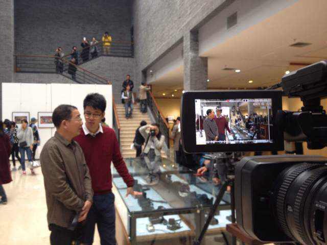 記者正在采訪資深攝影家。2014年11月8日攝于臺州書畫院