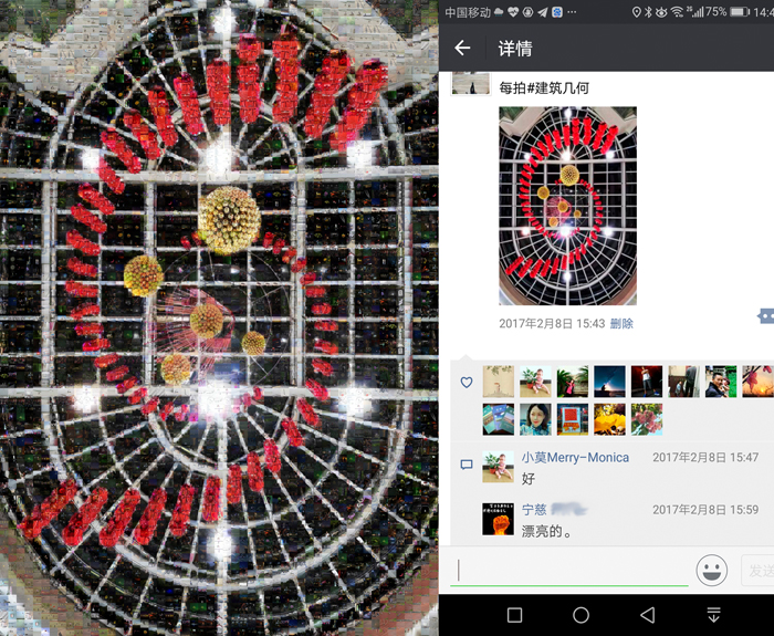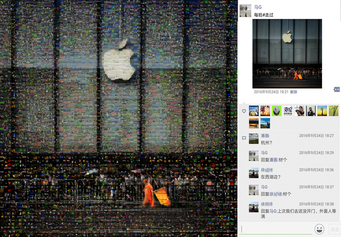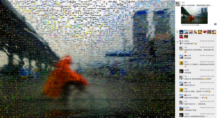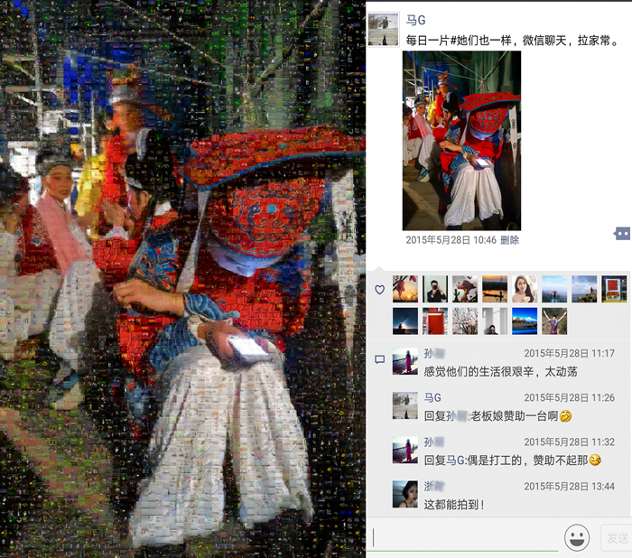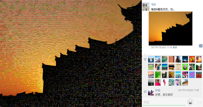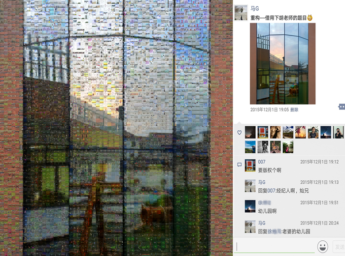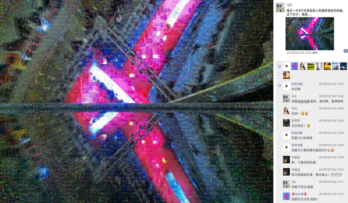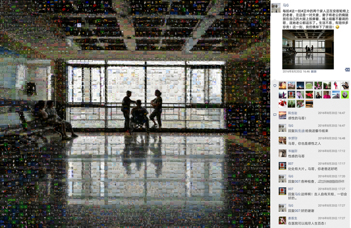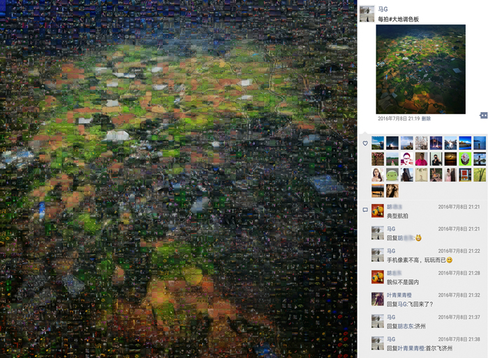 《多彩的生活》這組作品,我選取了近年來的一萬多張手機照片(因色彩需要,用了少量相機照片)作為素材,以“每日一拍”中的主題圖為底板,按色相、飽和度、明度需要,通過拼貼重組的方式,創(chuàng)造出畫面肌理感更強,充滿現(xiàn)實與幻想對比的新作品。整個作品(放大觀看)充盈著不同時期、不同地域、不同色彩的照片,猶如一個容納時空的大容器,一個豐富多彩的調(diào)色板。作品右部是從朋友圈截屏下來的相應主題圖,其中點贊的頭像和留言仿佛一幅畫中的印章和題跋,它既對作品加以說明,又豐富了作品的藝術(shù)呈現(xiàn)力,更賦予作品鮮明的時代特性。