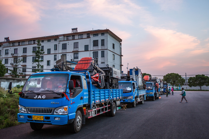 麥?zhǔn)旒竟?jié),江蘇銅山的李平夫婦、周意叔侄也正整裝待發(fā)。他們組成了一支車隊(duì)——4輛車、4輛收割機(jī)、8個(gè)人,每年五月中旬趕到浙江,前來收割成熟的小麥和油菜。