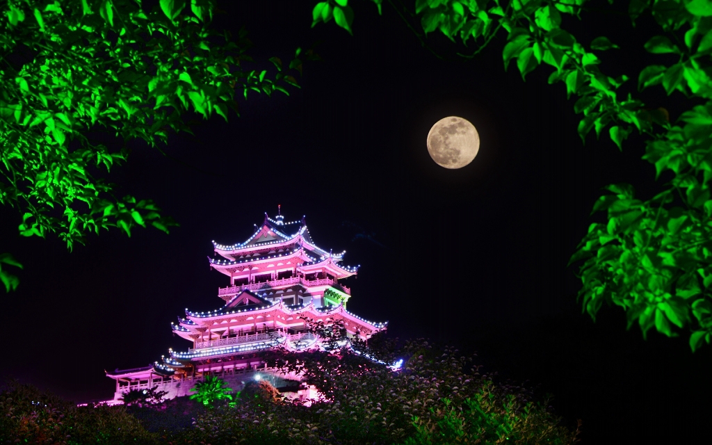 夜色中,一輪明月掛在天空,與東輝閣交相輝映。