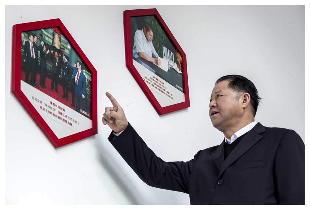 返回頂部>> 照片說明: 《懂事長的心路歷程》組照4。懂事長在公司上市那天的合影照前,介紹當時上市的盛況。
