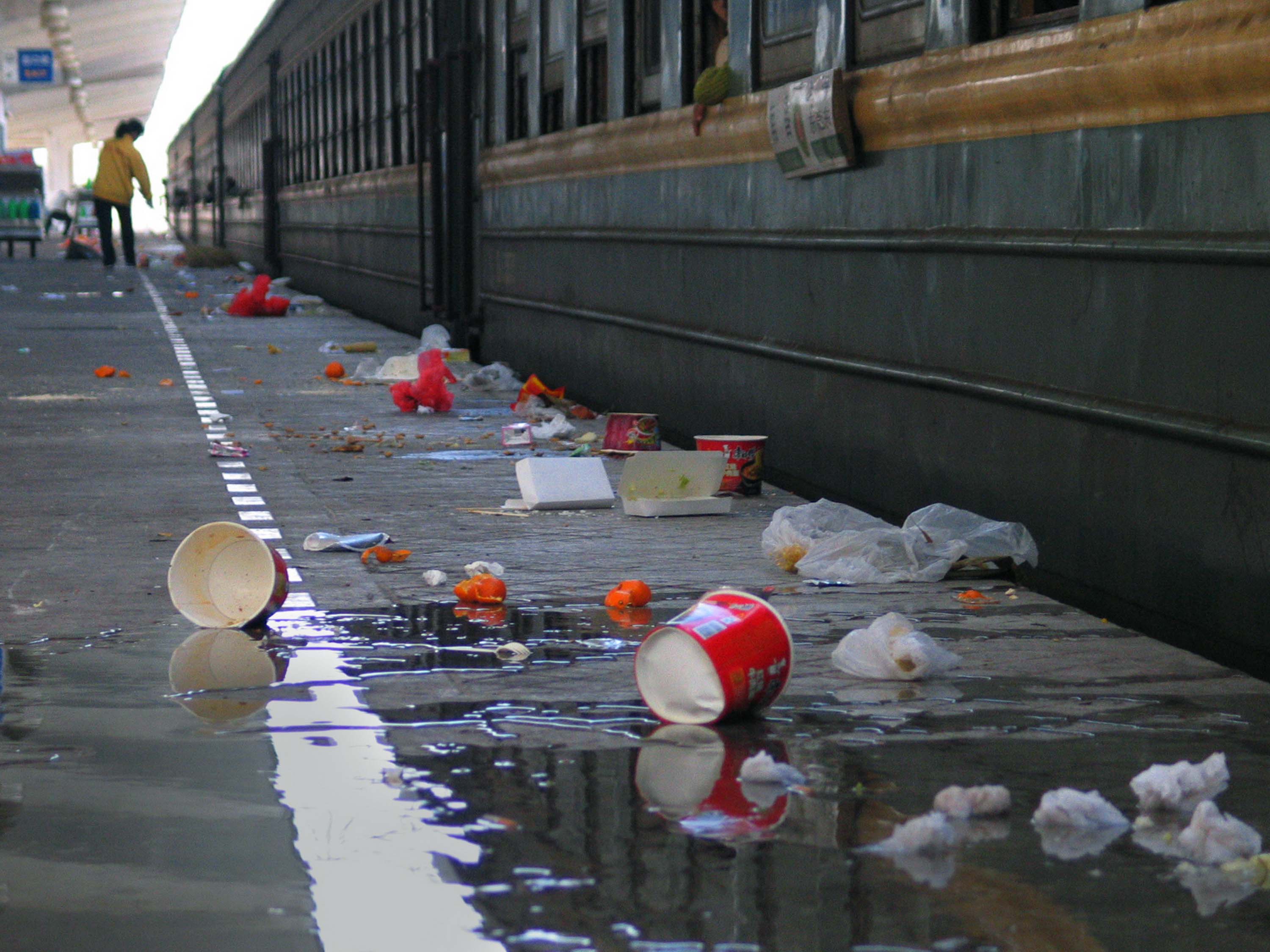 2007/2/26 金華火車站站臺上到處都是旅客丟出的方便面空盒和垃圾。