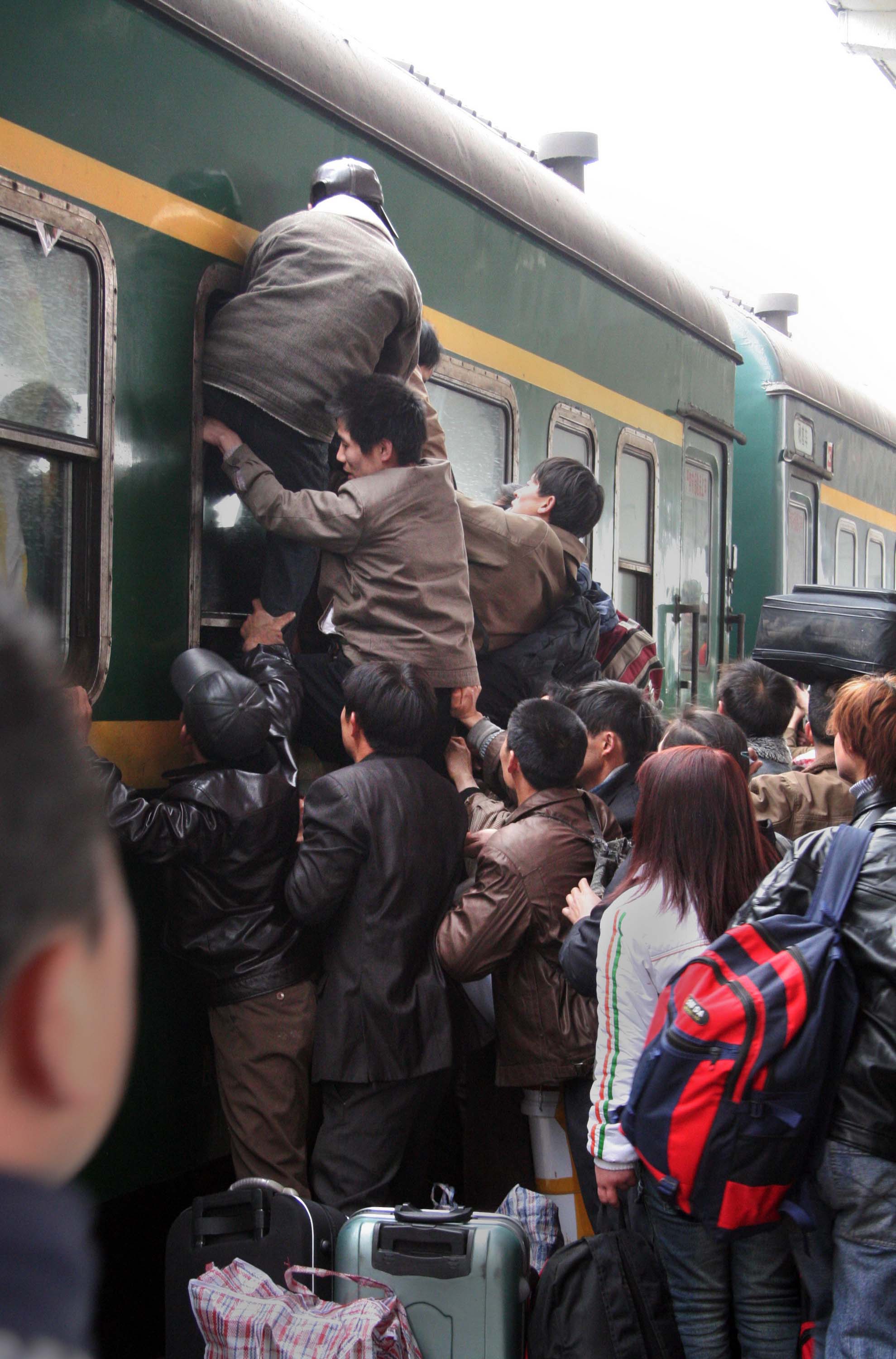 2006/1/23 金華火車站春運,當年鐵路運能不足,列車進站,因車廂擁擠,旅客艱難地攀爬車窗上車。