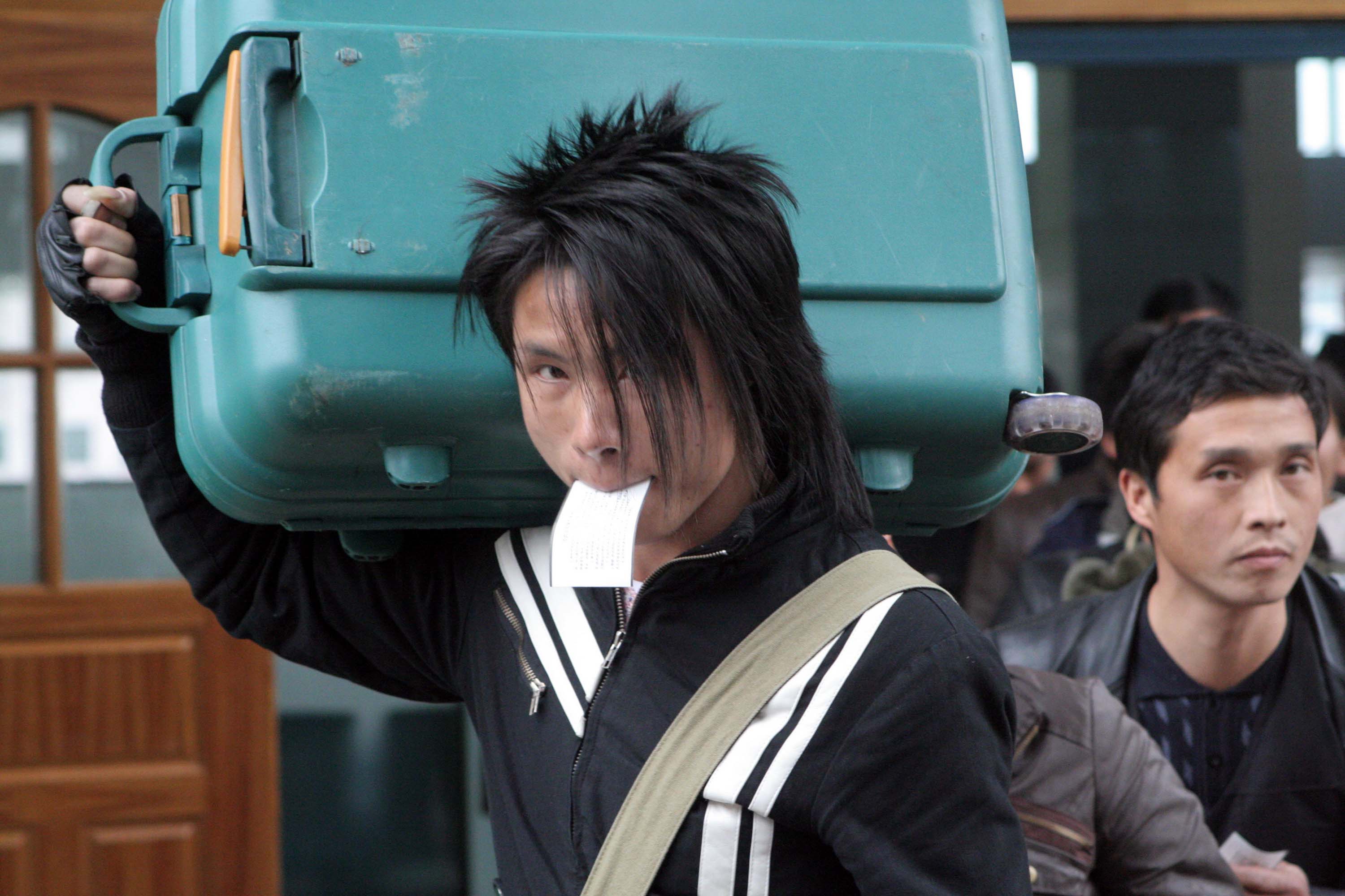 2008/2/25 金華火車站。留著時尚發(fā)型的年輕人扛著行李步入站臺,新一代民工與父輩們相比,已有很明顯的區(qū)別。