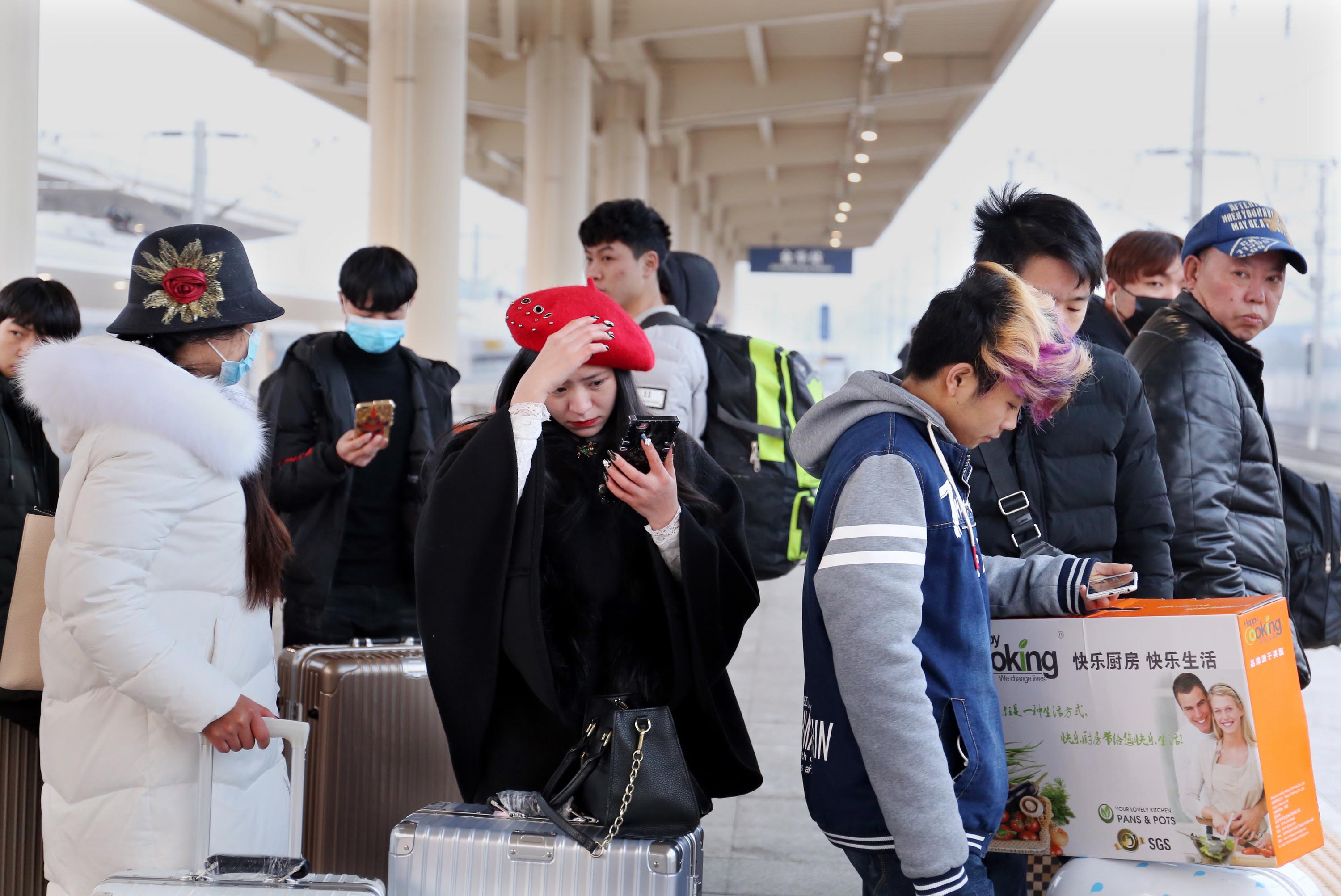 2018/2/11 金華火車站。準備上車回家過年的旅客在站臺上整理儀容。