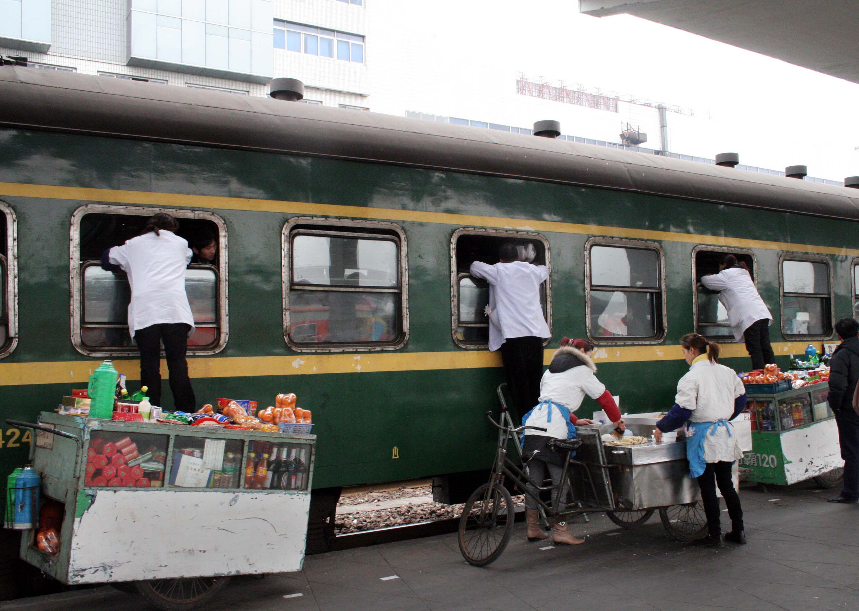 2006/1/23 金華火車站站臺上,售貨人員爬在售貨小車上攀著車窗向車內(nèi)旅客兜售食品。