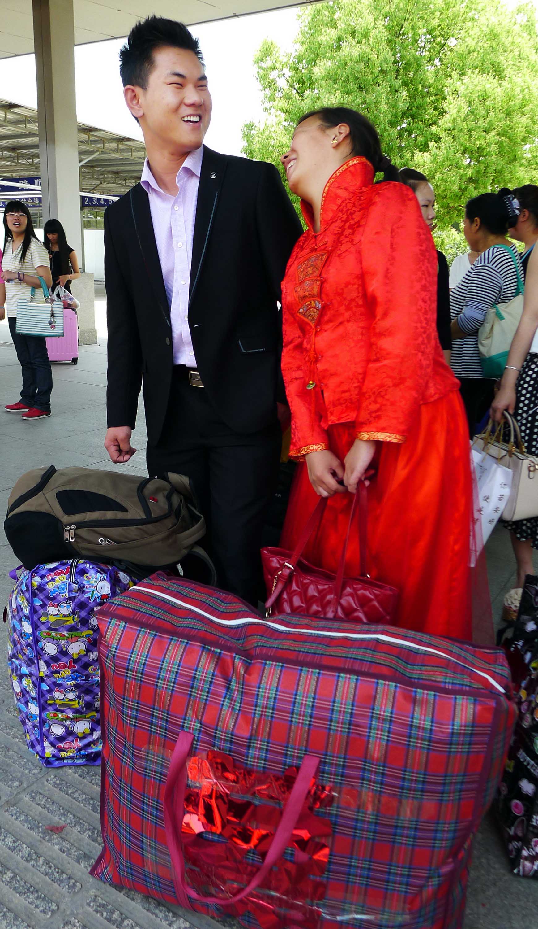 2014/5/2 義烏火車站。一對結(jié)婚新人在站臺上等車,準備乘坐動車回老家走訪親戚。