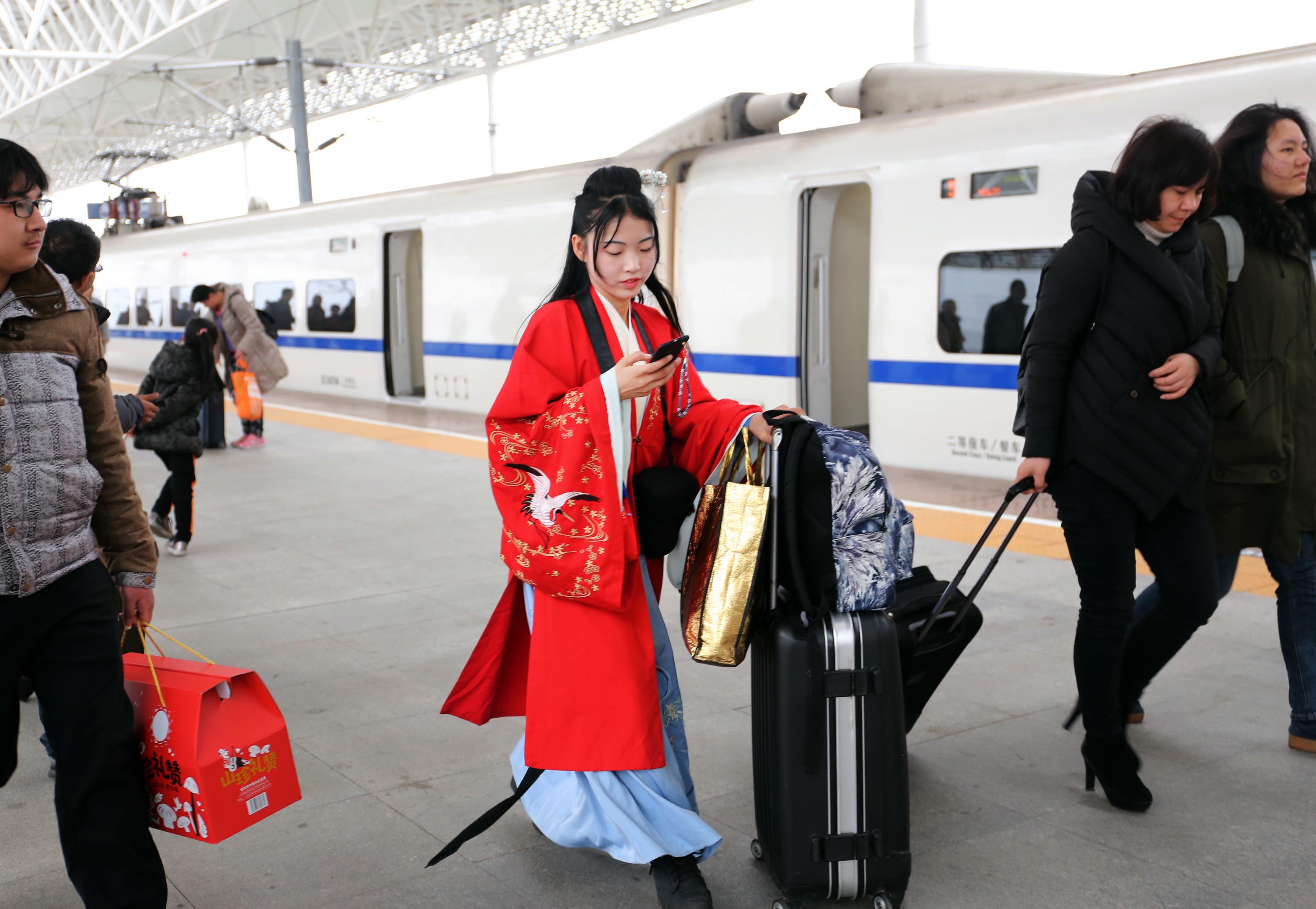 2018/2/15 大年三十,穿著漢服的旅客,從金華乘坐高鐵到嘉興過年。