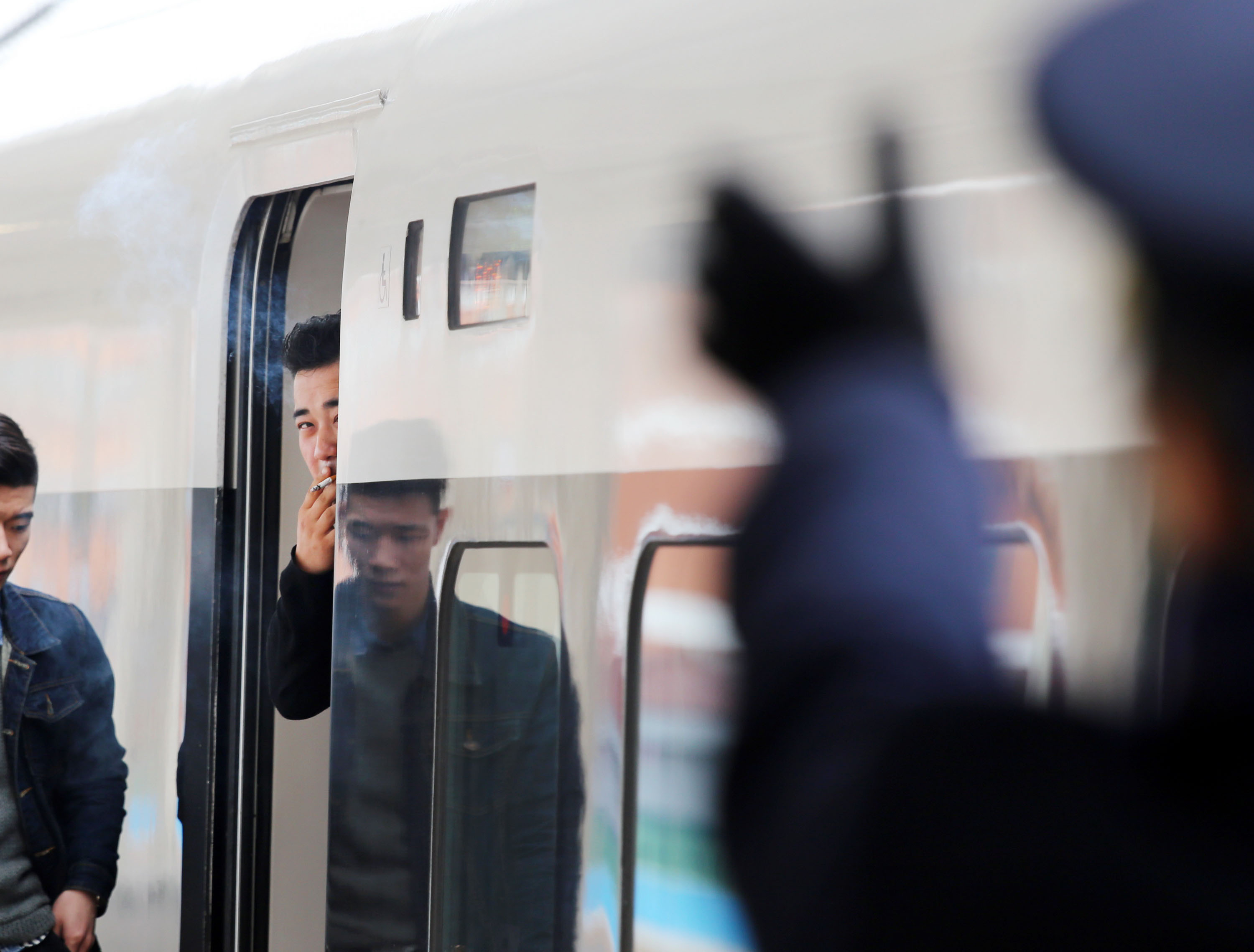 2018/2/21 金華火車站客運員讓下車抽煙的旅客趕緊上車。高鐵列車上禁煙,讓有煙癮的旅客不太好受,短短二分鐘的停站時間,旅客一支煙沒吸幾口,有點依依不舍,但也無奈,公眾場合禁煙已成社會共識。
