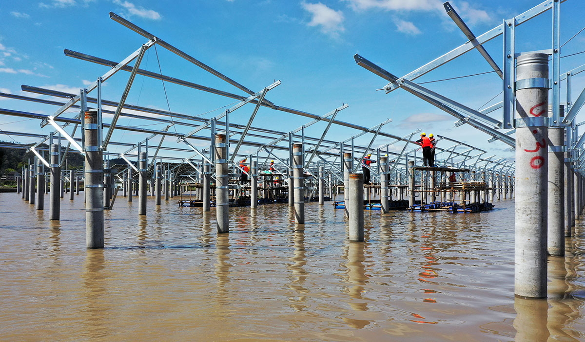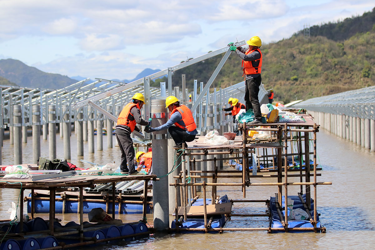 建設(shè)者正在安裝光伏板支架。