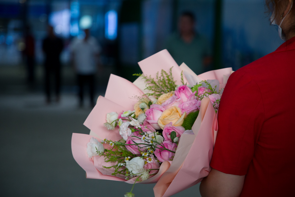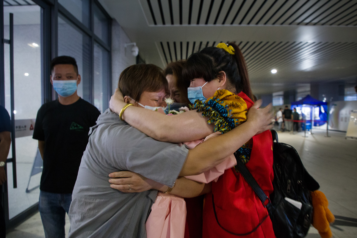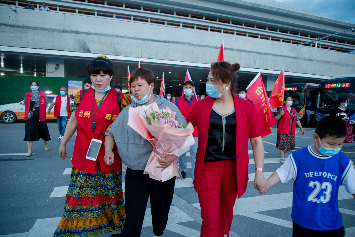 在臨海站大門口,大姐手捧鮮花等待歸家的妹妹郭春娟。