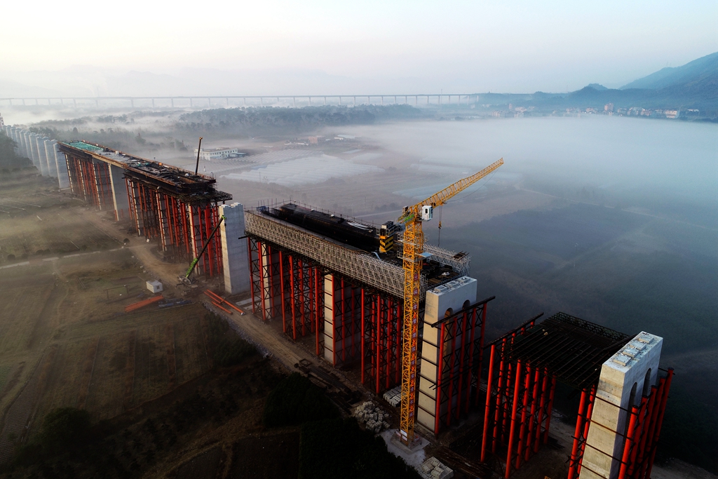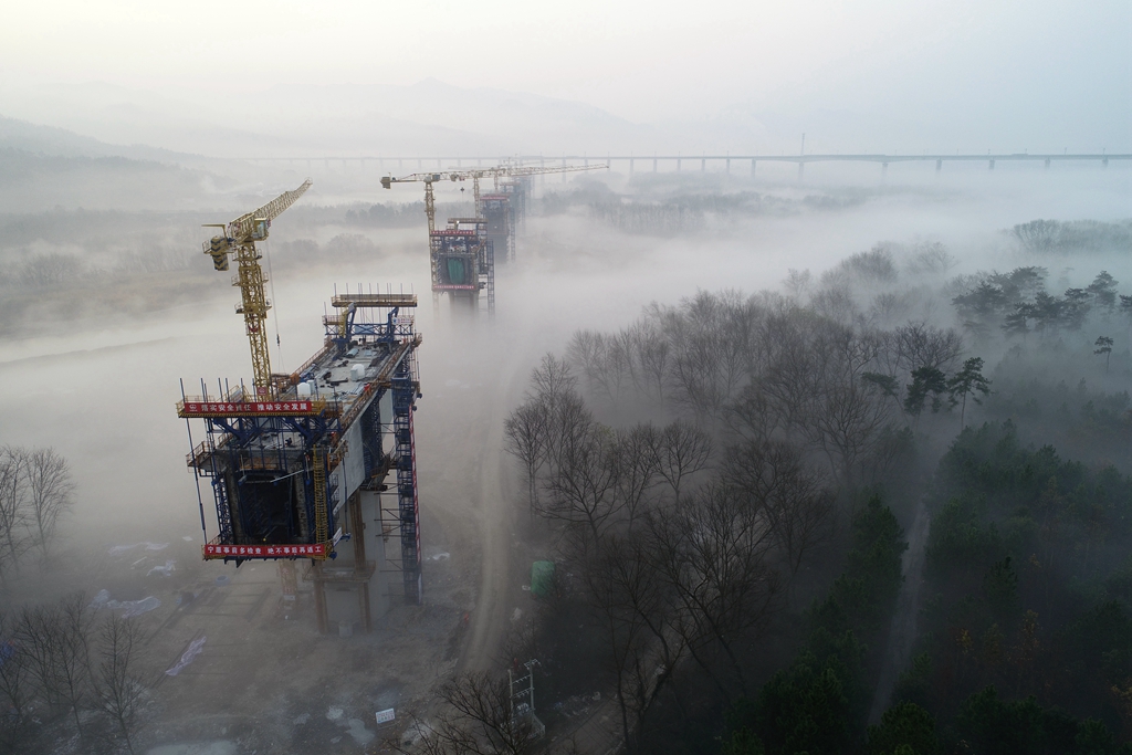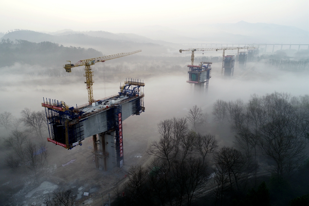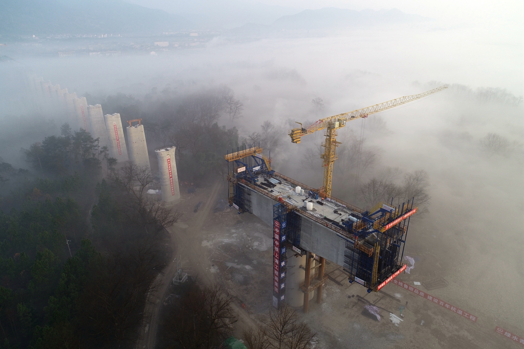 冬日,云霧彌漫,建設(shè)之中的杭溫高鐵在云霧之中時隱時現(xiàn),構(gòu)成一幅美麗的圖畫。