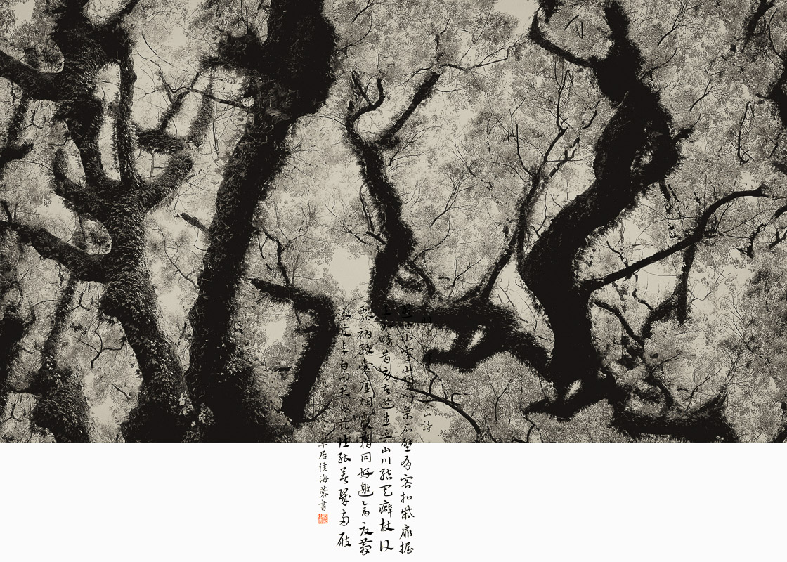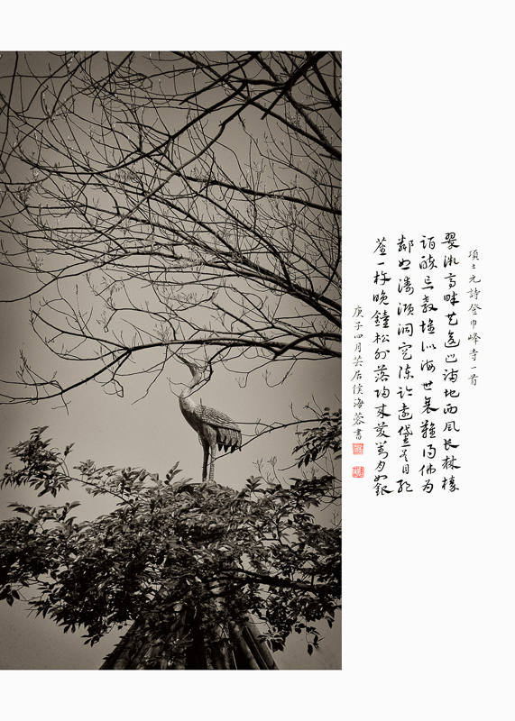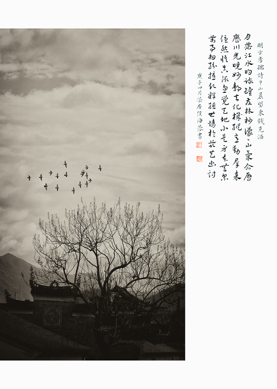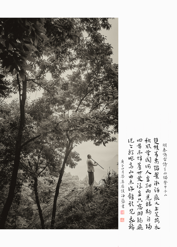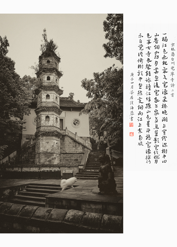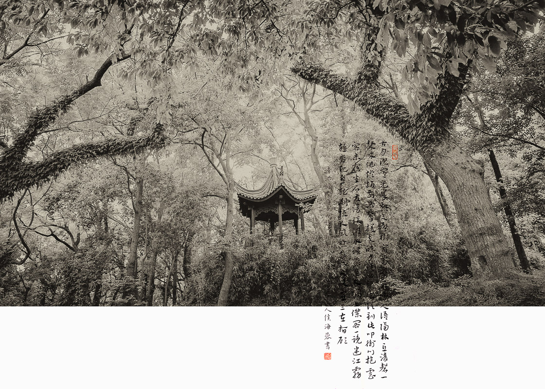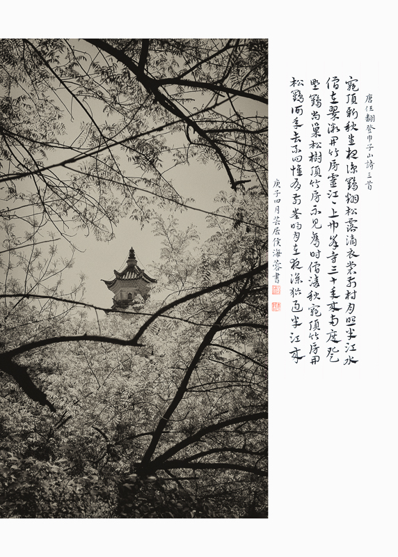 作品介紹: 家在雙峰蘭若邊,一聲秋磬發(fā)孤煙。 山連極浦鳥飛盡,月上青林人未眠。 山鳥飛盡,月上青林,這樣淡遠(yuǎn)超曠的意境, 是當(dāng)時任臨海鹽官的詩人顧況寫的,他筆下的“雙峰”,即是巾山,又名巾子山,位于臨海市,高百余米,兩峰聳立,中垂凹谷,三面臨街,南瀕靈江,臺州府城墻依山而走。 巾山環(huán)境清幽,空翠靈秀,以其古木蔥蘢、山色清麗,且半是清輝,半是幽暗,明暗相映,更富詩意,據(jù)初步統(tǒng)計,從唐朝開始,歷代吟詠巾山的詩作辭賦多達(dá)1300余首。巾山成為一座名副其實的“詩山”,也因此成為了臺州的文化地標(biāo)。 于是,我萌生了一個想法,能否用影像的方式,在時隔千年后今天,去尋找這些孕育了如此優(yōu)美動人詩歌的地方如今是怎樣的景象。我多次登上巾山,用鏡頭去發(fā)現(xiàn)和詮釋詩人筆下的意境,讓古詩用另一種方式繼續(xù)流傳,于是就有了這組《巾山詩行》。(16:9) ,合成的書法作品系侯海蓉作品(已授權(quán))