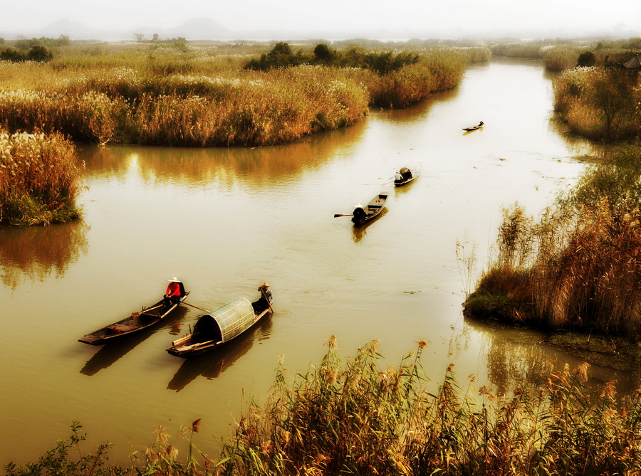 深秋季節的下渚湖,蘆花正旺,船兒蕩舟湖面,一幅田園景象