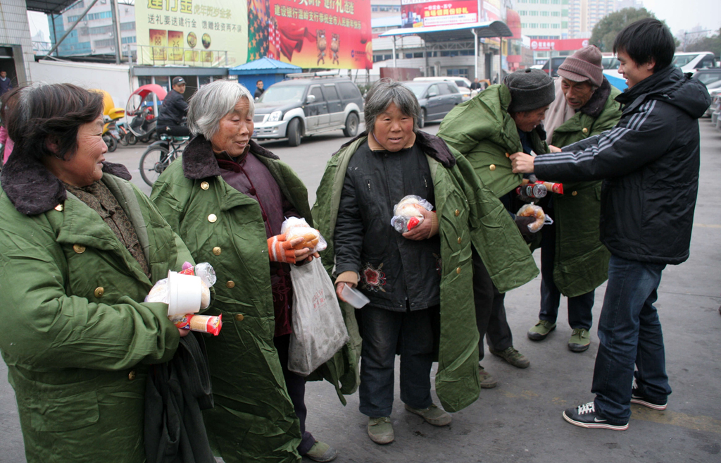 春節前夕,天寒地凍, 溫嶺市民政局救助站拿出一批棉大衣和食物,救助街頭流浪者。
