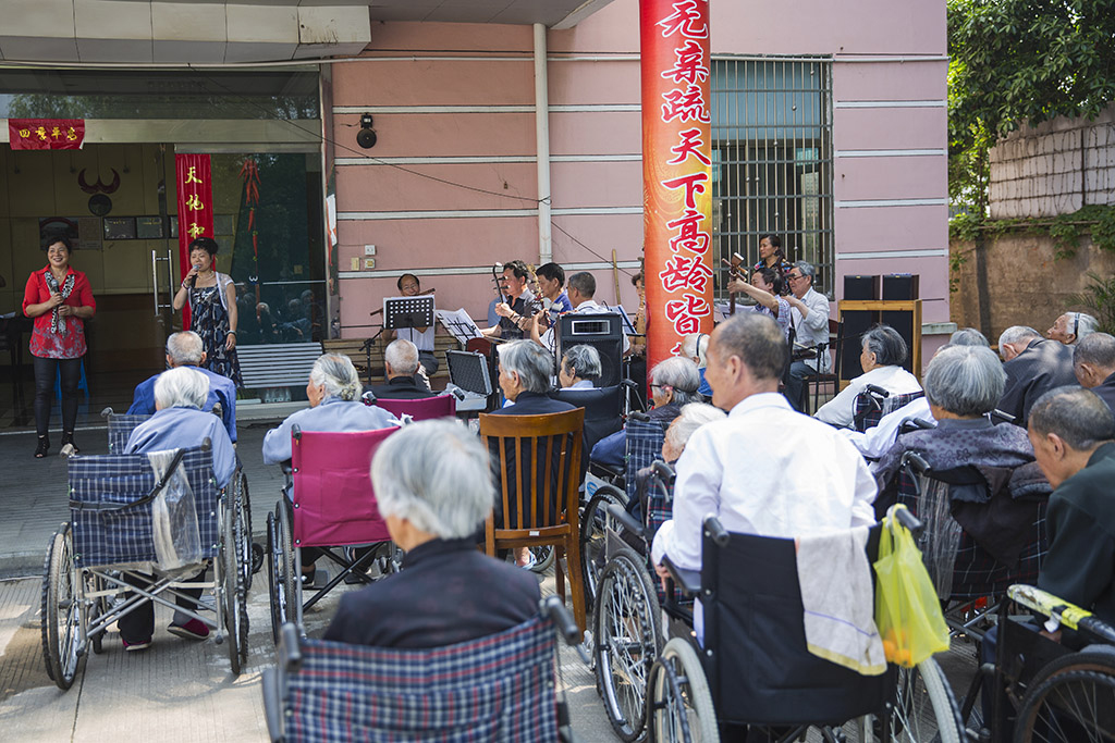 老人們坐在輪椅上認真地觀看志愿者送來的文藝表演。