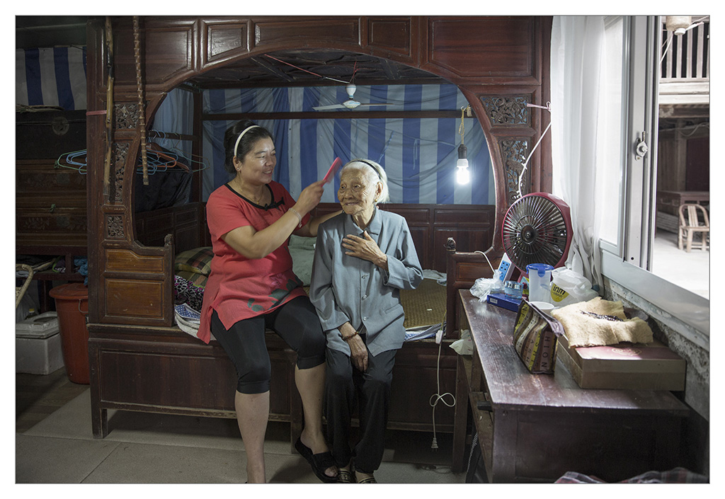 返回頂部>> 照片說明:  侄女為九十多歲老人梳妝,照顧著老人的起居生活。