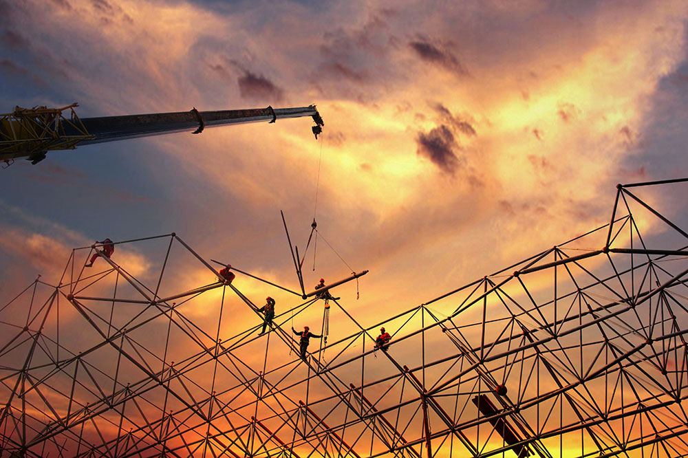 勞動工人在三門劇院建設(shè)。