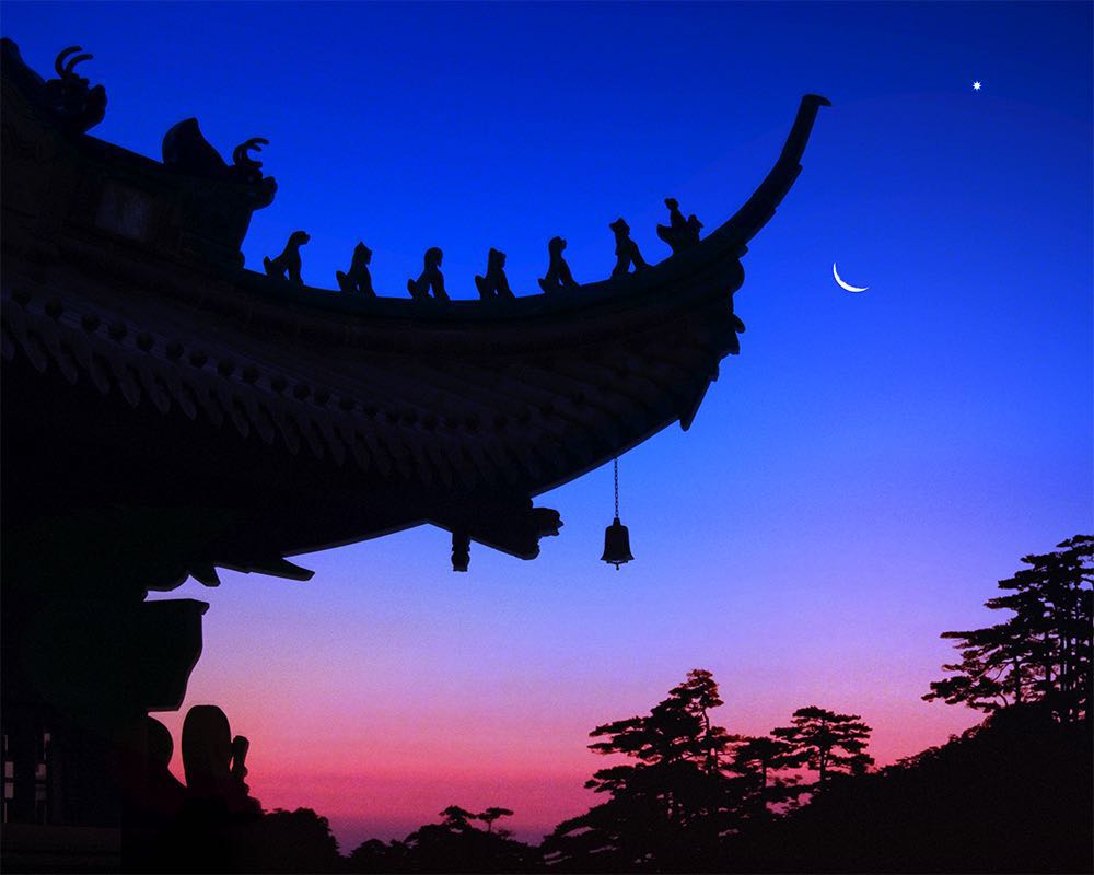 霞光、星光、月光、彩云交相輝映,與幻隱寺的飛檐翹角的剪影融為一體,構(gòu)成了一幅天上人間相互交融的美麗畫面。