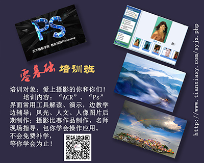 【開課時(shí)間】1月23日晚上18:30-21:001月24日9:00-12:00,14:00-17:001月30日9:00-12:00,14:00-17:00,18:30-21:001月31日9:00-12:00,下午老師帶領(lǐng)學(xué)員外景拍攝【學(xué)院簡介】“天下攝影學(xué)院”簡介“天下攝影學(xué)院”成立于2014年4月18日。經(jīng)過六年的努力,至目前已成功舉辦了121期攝影基礎(chǔ)、“Adobe Photoshop”數(shù)碼后期基礎(chǔ)、“Adobe Photoshop ”數(shù)碼后期高級培訓(xùn)班..