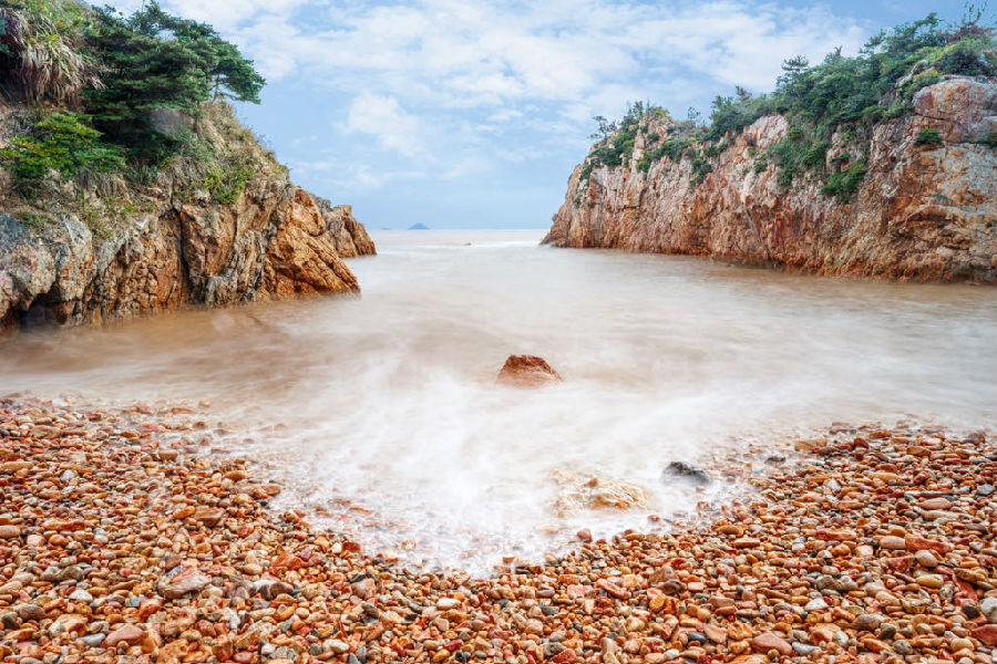 彩石灘因紅色彩石居多,故當?shù)貪O民多叫它“紅石灘”。每天兩次潮夕都是攝影創(chuàng)作時機,慢門拍攝更顯韻味!洋嶼島保持原生態(tài)。