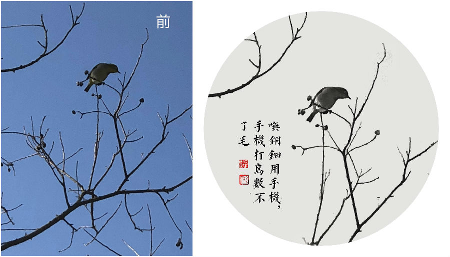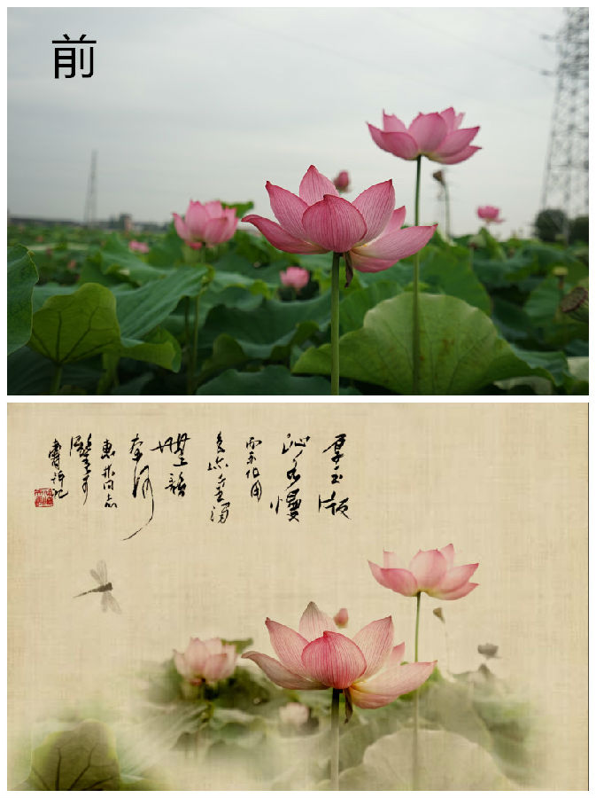 2、指定拍攝:建筑拍攝(矯正)、豎全景的人景拍攝(剪裁著色)、倒影(雙重曝光)、慢快門(油畫)、殘荷(黑背景與文字印章)、打鳥(Ocamera應(yīng)用)