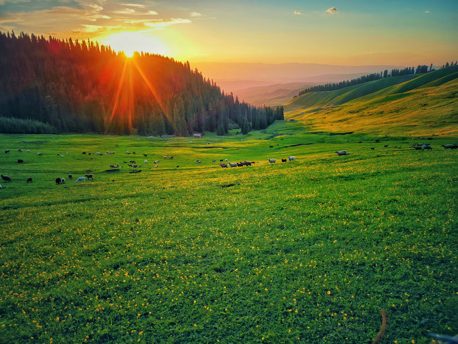 今日早起瓊庫什臺拍攝日出,在光影的映襯下,高低起伏的草原、一座座潔白的氈房和木屋,使草原充滿了生機(jī)和活力,令無數(shù)攝影人向往。后出發(fā)那拉提草原拍攝,那拉提草原自古以來就是著名的牧場,成吉思汗西征休牧于此。原野上山泉密布,溪流似網(wǎng),河道交錯(cuò),森林繁茂,被人們譽(yù)為“空中草原”,晚上入住那拉提。