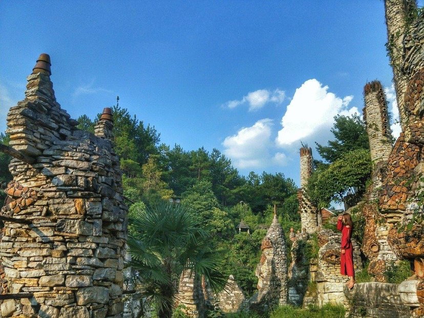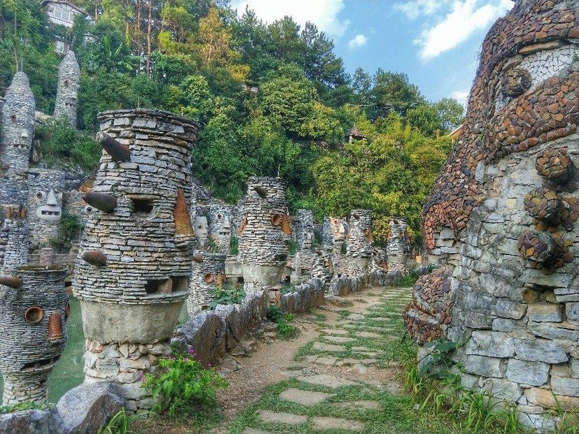 夜郎谷的城堡、長城、小橋、房屋、通往各地的路階都是四處收集粗獷的喀斯特巖石堆砌,宋培倫先生親自指導(dǎo)當(dāng)?shù)卮迕裼迷际侄五N打成型鑄造
