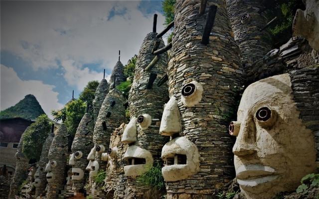 石頭雕像表情各異,是融合了貴州儺文化的人物頭像