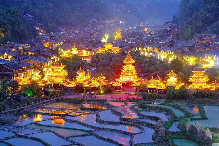 肇興侗寨位于貴州省黔東南州黎平縣,是黔東南侗族地區(qū)最大的侗族村寨。也是侗族的民俗文化中心。到2012年,居民1100余戶,6000多人。肇興侗寨四面環(huán)山,寨子建于山中盆地,兩條小溪匯成一條小河穿寨而過。寨中房屋為干欄式吊腳樓,鱗次櫛比,錯落有致,全部用杉木建造,硬山頂覆小青瓦,古樸實用。肇興侗寨分內(nèi)姓外姓,對外全為陸姓侗族,分為五大房族,分居五個自然片區(qū),當(dāng)?shù)胤Q之為"團(tuán)"。分為仁團(tuán)、義團(tuán)、禮團(tuán)、智團(tuán)、信團(tuán)五團(tuán),肇興侗寨是黎平侗鄉(xiāng)風(fēng)景名勝區(qū)的核心景點(diǎn),2005年被《中國國家地理》評選為“中國最美的六大鄉(xiāng)村古鎮(zhèn)”之一,2007年被《時尚旅游》和美國《國家地理》共同評選為“全球最具誘惑力的33個旅游目的地”之一。