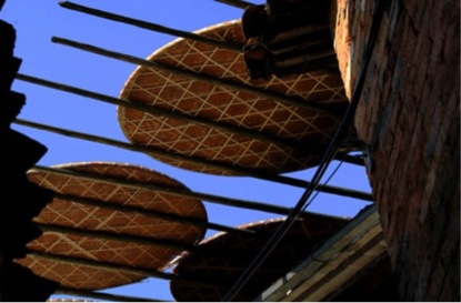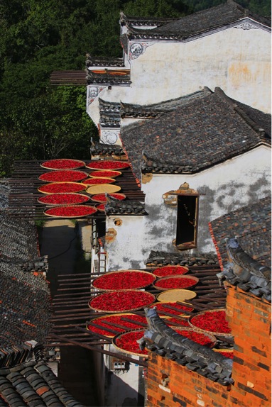 婺源篁嶺,地處江南山區(qū),因村中“地?zé)o三尺平”,村落依山而建,村民房屋呈階梯狀U型分布,受地形限制,山中村民沒(méi)有空地晾曬農(nóng)作物,只能使用竹曬匾晾曬在自家眺窗前木架上,既不占地方,又便于收藏。每年夏秋交替,房前屋后成了竹曬匾的世界,長(zhǎng)長(zhǎng)木架托起圓圓的曬匾,春曬茶葉、蕨菜、水筍;夏曬茄子、南瓜、豆角;秋曬黃豆、稻谷、辣椒……,形成了一幅幅五色斑斕的調(diào)色板,山居人家,對(duì)曬秋有著深厚的情感,篁嶺曬秋已形成一種民俗文化現(xiàn)象,一個(gè)文化符號(hào),代表了一種社會(huì)生活方式,因此,婺源篁嶺也被外界稱(chēng)為“曬秋人家”。