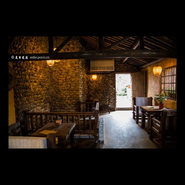 “豬欄茶吧”的整體格調(diào)延襲了“牛欄咖啡”的風(fēng)格,兩者有異曲同工之妙。不同的是,“牛欄咖啡”是單體建筑,“豬欄茶吧”是一個(gè)小小群落,比牛欄豐富了許多,裝修做工也比“牛欄咖啡”精到。地面多以三合土為主,總吧臺(tái)那間采用磚頭。基本保留了豬欄原有的石頭墻,清洗消毒后進(jìn)行噴漆保護(hù),有的還保留生土墻,屋頂作了加固吊頂?shù)刃夼f處理。每間茶吧都裝有空調(diào)、音響,角落和空閑處適當(dāng)擺放農(nóng)村生活生產(chǎn)的老物件,加以點(diǎn)綴。進(jìn)入茶吧區(qū)你就會(huì)感覺(jué)到一股濃郁的鄉(xiāng)味撲面而來(lái),這就是茶的清香、農(nóng)耕生活的原鄉(xiāng)、民風(fēng)民俗的親香。