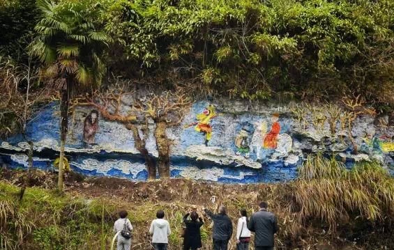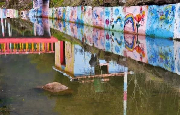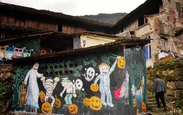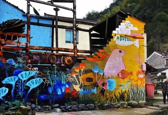 ◆連接:【金滿坑村】村子里的民舍、坑岸、道路、石階、邊坡、崖壁的涂鴉色彩和主題越來越豐富、天天有新變化。每逢雙休美術(shù)家與學(xué)生、大人與小孩齊上陣,他們既是粉刷匠又是藝術(shù)家。因為他們的到來,使這個原先不起眼的小山村,變得張揚可愛起來;這里成了瘋狂隨性包容多元的藝術(shù)天堂。