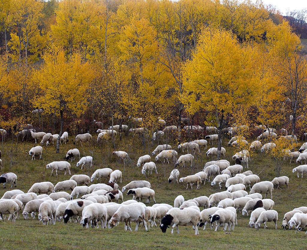 下午:南井、暖水(9月中下旬這里山丁子樹、榆樹、綻放紅色、綠色,白樺樹葉子呈現(xiàn)金黃色,草地也已變淺黃,藍天白云依舊)樺樹溝、蛤蟆壩、天太永一天(自然風(fēng)光、河流與民俗結(jié)合的地方,中午牧民家里就餐)東溝金線、后窩鋪、劉家地、貓兒山(牛羊成群、色彩艷麗)